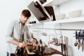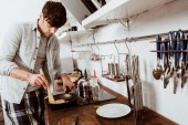 przycięty obraz młodego człowieka gotowanie jajecznica na śniadanie w kuchni