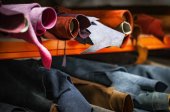 Różnych kawałków skóry w rolkach. Kawałki kolorowych skór. Rolek naturalny brąz i czarny i inne skórzane. Surowce do produkcji, torby, buty, odzież i akcesoria.