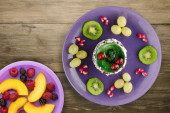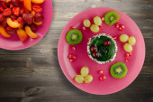 deser ciasto i owoce (winogrona, kiwi, granat) na tle drewnianych. deser na widok z góry płyty