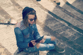 Młoda dziewczyna z tatuażem i dredy, słuchanie muzyki, siedząc na schodach