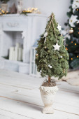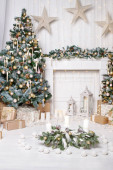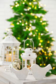 Christmas Latarnia nad białym tle drewnianych z światła. Nowy rok ozdoba z gałęzi jodły w odcienie bieli.