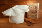 Kucharski kapelusik z łyżki i ostrze na białym tle
