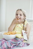dziecko jedzenie pizzy z pilotem zdalnego sterowania