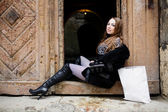 Atrakcyjna kobieta slim czerwony elegancka bluzka i czarna spódnica pozowanie, siedząc na schodach. Fotografia mody.