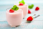 dwie porcje różowy jogurtu ze świeżych truskawek na turkus tło drewniane