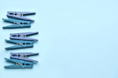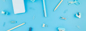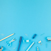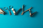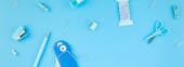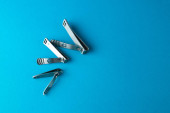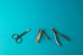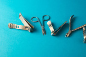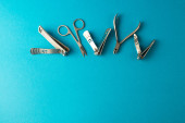 zestaw narzędzi do manicure i paznokci na niebieskim tle.
