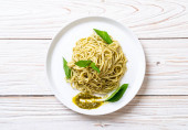 Homamade spaghetti z sosem pesto, oliwa z oliwek i liści bazylii.