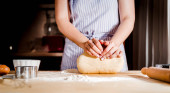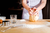 Dokonywanie ciasta przez kobiety ręce na drewnianym stole