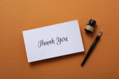 przycięte osobę posiadającą biała pocztówka z Dziękuję literowanie na białym tle na żółtym tle