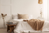 Zdjęcie "Bawełniany kwiat w rustykalnym wazon na komodzie sypialnią zaprojektowany z naturalnych materiałów, prawdziwe zdjęcie z miejsca kopii na pustej ścianie" może być wykorzystywane do celów osobistych i komercyjnych zgodnie z warunkami zakupionej licencji Royalty-free. Obraz jest dostępny do pobrania w jakości wysokiej rozdzielczości do 5760x3840.