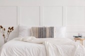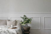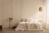 Bawełniany kwiat w rustykalnym wazon na komodzie sypialnią zaprojektowany z naturalnych materiałów, prawdziwe zdjęcie z miejsca kopii na pustej ścianie