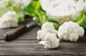 Kalafior na drewniane deska z nożem. Martwa natura z żywności. Proces gotowania. Koncepcja wegetariańskie. Gotowania. Wegańskie. Kapusty. Żywności ekologicznej.