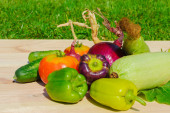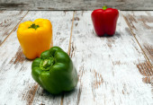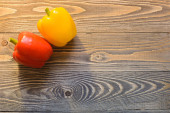 Żółte i czerwone papryki i pomidorów na jasnym tle drewnianych
