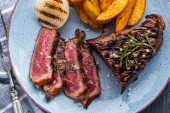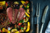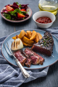 Sałatka z ciepłych wołowiny z boczniakami, pomidory i zieleni