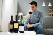 Ręka mężczyzny, co nie gest dla kieliszek wina na biurko z drewna