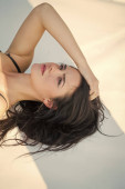 Radosna dziewczyna ładny odkryty. Pielęgnacja skóry. Kosmetyk makijaż i Pielęgnacja skóry. Salon piękności i Fryzjer. Ładna dziewczyna z długo Brunetka włosy. Moda piękny portret seksowny kobiety. Modelka glamour. Pielęgnacji twarzy