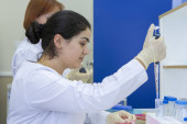 Młody naukowiec pracuje w nowoczesnym laboratorium biologiczne młodych kobiet badania naukowiec przygotowanie i analizując szkiełka mikroskopowe w laboratorium badawcze.