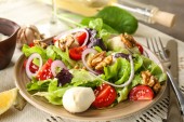 Pyszne świeże sałatki z orzechami na talerzu, zbliżenie