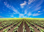 pole ziemniaków na zachód słońca pod błękitne niebo