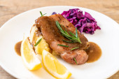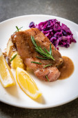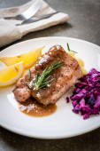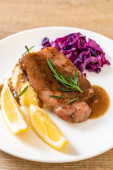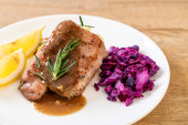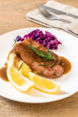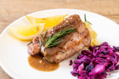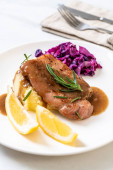 Stek wieprzowy z czerwoną kapustą i ziemniakami puree na białym talerzu