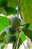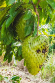 Poza na jasny, słoneczny dzień, wiszące przez jego łodyga z Annoma muricate drzewo z rodziny flaszowcowatych jest owoce duże dojrzałe Flaszowiec miękkociernisty. Inne popularne nazwy tego owocu jest graviola, guyabano lub guanabana,