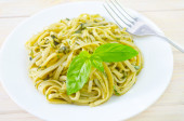 Homamade spaghetti z sosem pesto, oliwa z oliwek i liści bazylii.