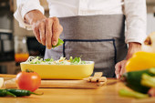 przycięte strzał młodego człowieka w fartuch krojenia warzyw w kuchni