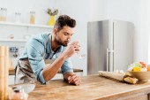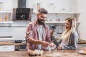 uśmiechający się młody człowiek w fartuch, przygotowanie ciasta w kuchni