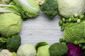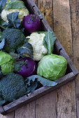 Różne odmiany kapusty na podłoże drewniane. Organiczne świeże warzywa - kalarepa, brokuły, kalafior, kapusta fioletowy. Surowa żywność. Zdrowa żywność.