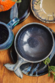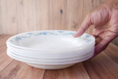 Kobiece ręka wyciąga czyste płyty z szafki kuchennych