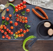 Zdjęcie "Widok z góry dojrzałe czerwone pomidory cherry, Cięcie deska z stary nóż i skorupy jaj kurzych," może być wykorzystywane do celów osobistych i komercyjnych zgodnie z warunkami zakupionej licencji Royalty-free. Obraz jest dostępny do pobrania w jakości wysokiej rozdzielczości do 5760x3840.