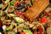 Preparation fried chicken fillets with vegetables