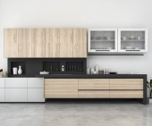 Wnętrze nowoczesna kuchnia z białe ściany, drewniane podłogi, szare szafki i zielone blaty z umywalką i piekarnik. renderowania 3D