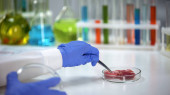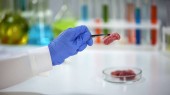 Biochemia naukowiec wstrzykiwanie płynu w pomidor za pomocą strzykawki, badania pestycydów