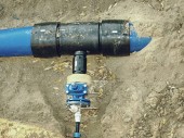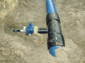 Regionalnych wodociągów wiejskich rurociągu w wykopie. Armatura wodno-kanalizacyjnych i wodociągowych, wspólne domy linie z rurociągu głównego miasta.