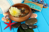 skład spa morze na drewnianym stole na niebieskim tle naturalny