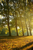 piękne drzewa w lesie jesienią, jasne światło słoneczne o zachodzie słońca