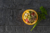 piękny starter brzoskwiń nadziewane z musem z tuńczyka i ozdobione orzechy włoskie zbliżenie na stole. poziomy widok z góry z przez rodzinę