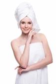 Portret młodej kobiety ładne ręczniki na białym tle