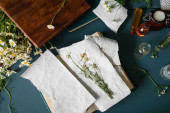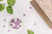 Filiżankę herbaty, książki, kwiaty chryzantemy i macaroons w tacę na stole. Przytulny dom koncepcja. Farbowanie i przetwarzania zdjęć w stylu kinowy.