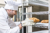 dorosły mężczyzna baker, dotykając świeżo upieczonym chlebem na kuchenne
