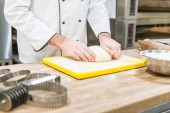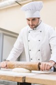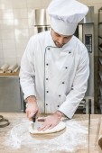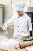 dorosły mężczyzna baker rozpraszania mąki na desce w kuchni