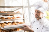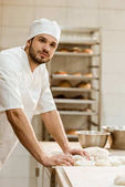 Szef kuchni kołyszący na zewnątrz ciasta z wałkiem na drewnianym stole