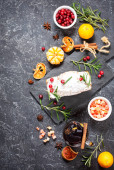 Boże Narodzenie grzane wino z przyprawami i plastry pomarańczy na stole z kamienia. Tradycyjny napój na zimowy wypoczynek. Widok z góry