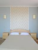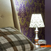 Sypialnia wnetrze fragment z oświetleniem. Skandynawski styl