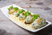 Solone pieczarki serwowane z kwaśną śmietaną i pietruszką