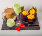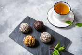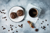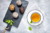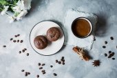 Filiżankę herbaty i ciasteczka na czarnym tle kamienia. Dzień dobry koncepcja.