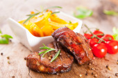 Zdjęcie "Grillowany stek wołowy z sałatką ze świeżych warzyw, pomidorami i sosem na drewnianą deską do krojenia" może być wykorzystywane do celów osobistych i komercyjnych zgodnie z warunkami zakupionej licencji Royalty-free. Obraz jest dostępny do pobrania w jakości wysokiej rozdzielczości do 5760x3840.