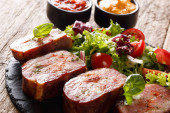Grillowany stek wołowy z sałatką ze świeżych warzyw, pomidorami i sosem na drewnianą deską do krojenia