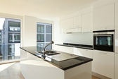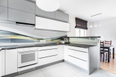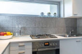 Nowoczesna kuchnia w kolorach białym, wysoki połysk płytek i nową kuchenkę mikrofalową i piekarnik